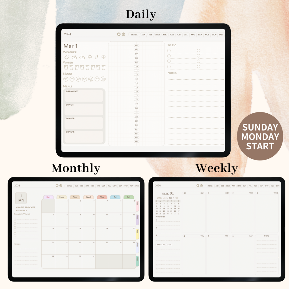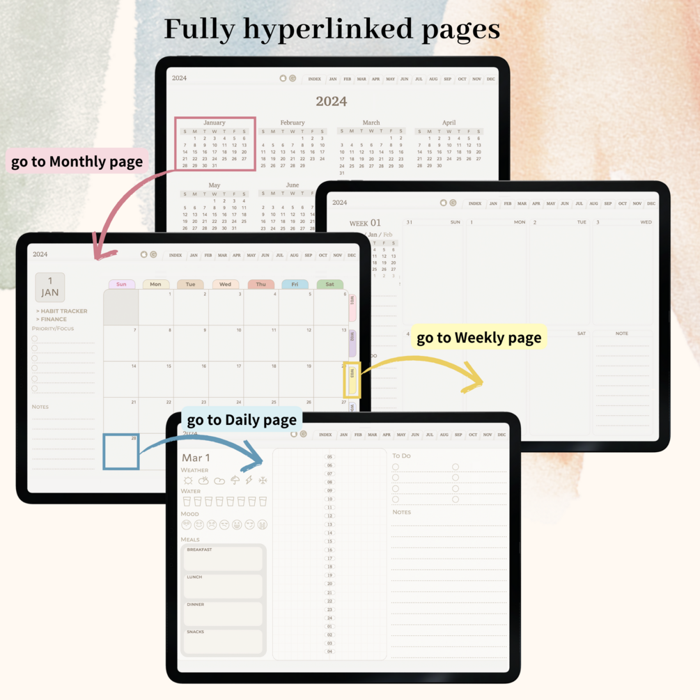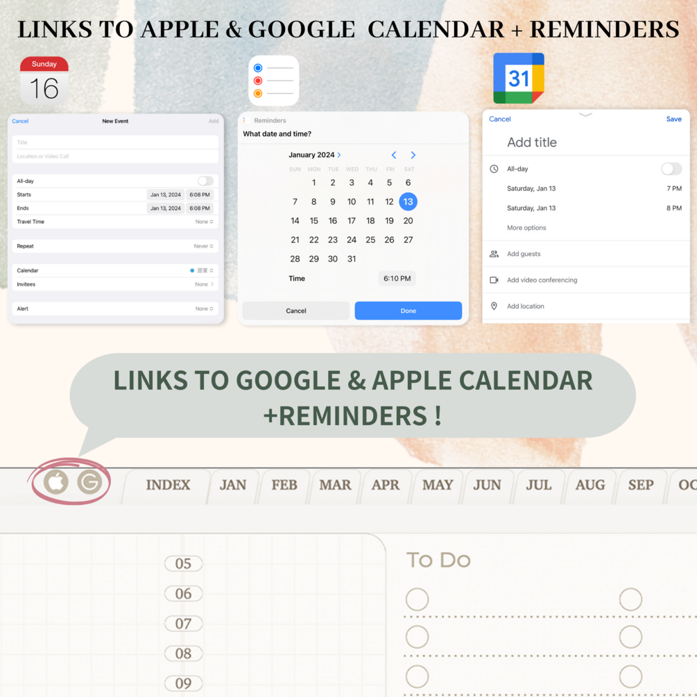 But here's the magic – unleash your creativity on every page! Deck it out with high-quality hand-drawn illustrations, turning your daily planning into a unique masterpiece. Ideal for Goodnotes or Notability on your iPad or tablet, this planner mixes functionality with style. And guess what? It's linked directly to Apple & Google Calendar + Reminders for ultimate efficiency with a visual twist. Transform every planning session into a work of art with our all-in-one digital companion. Your organized and artsy life starts here!
