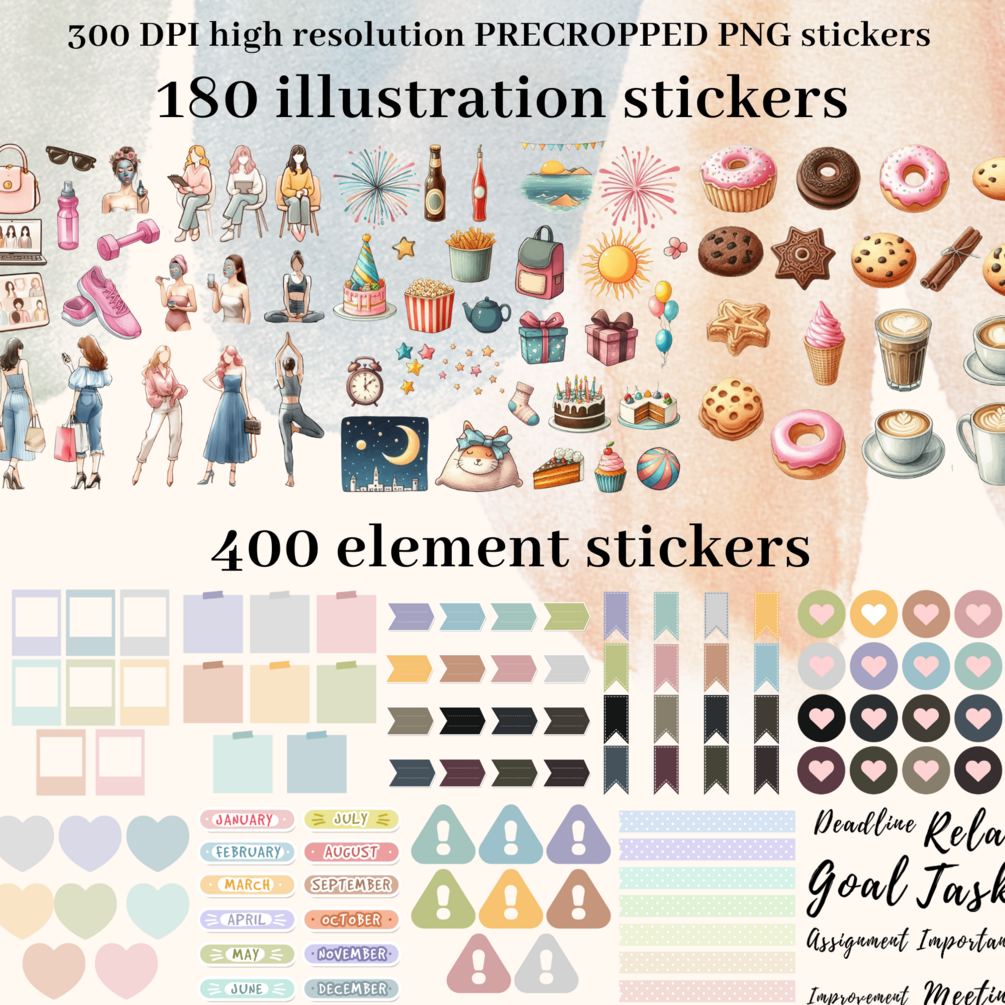 The perfect blend of organization and art! With over 490 chic and minimalist pages and 21 stunning covers, this planner is a game-changer. Elevate your planning vibes with 300 DPI high-res PRECROPPED PNG stickers – 180 illustrations and 400 elements for all the feels.