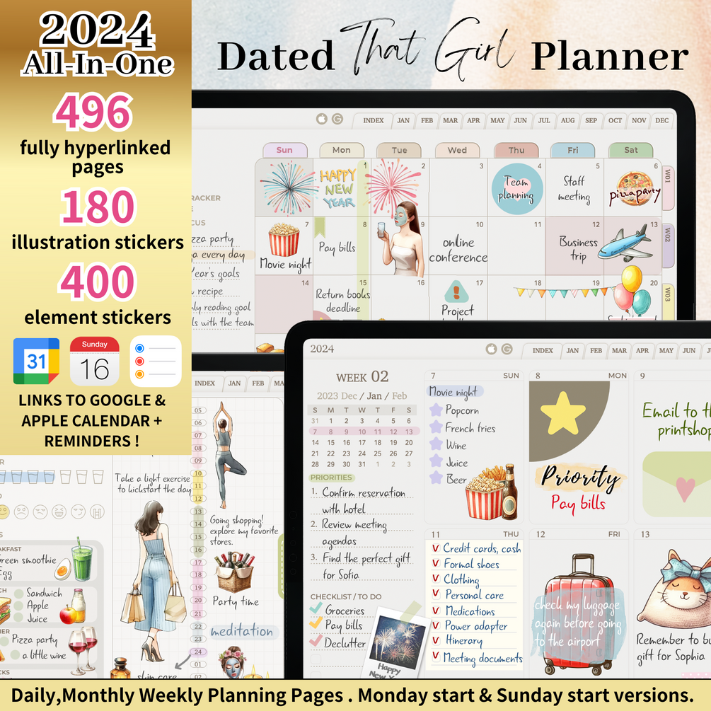 2024 Dated Goodnotes Digital Monthly Planner | Templates | Taht girl Minimalist planner | Hand Drawn Illustration Planner Stickers