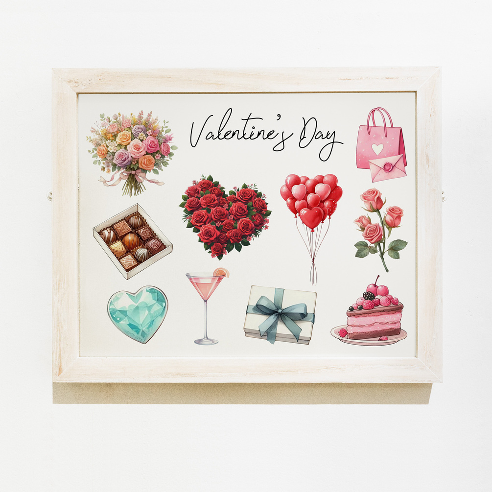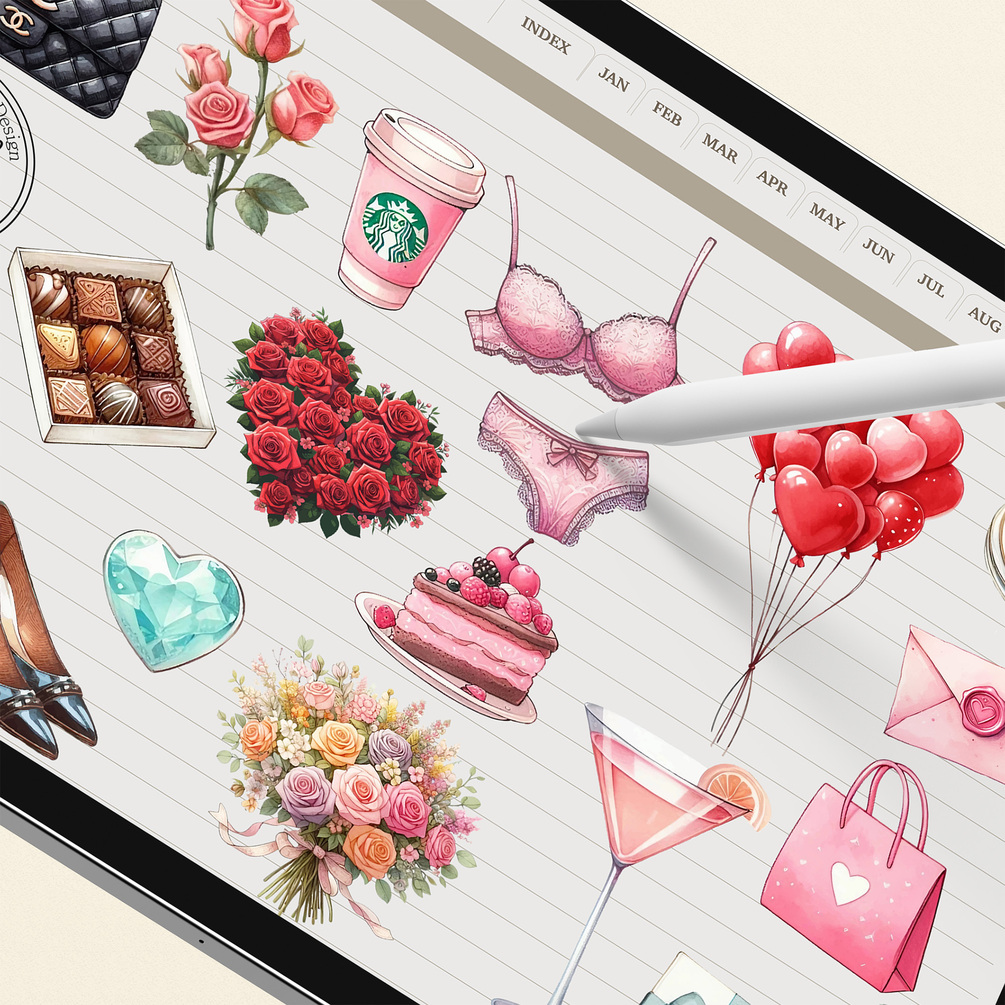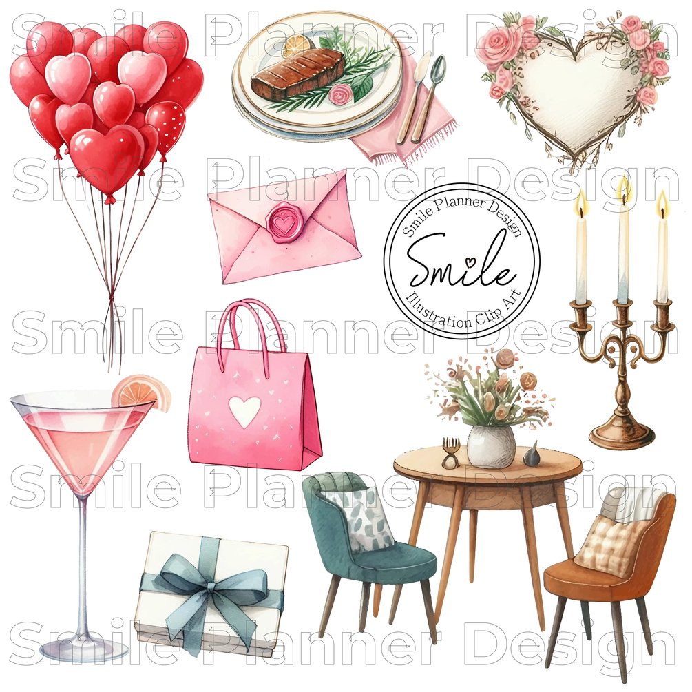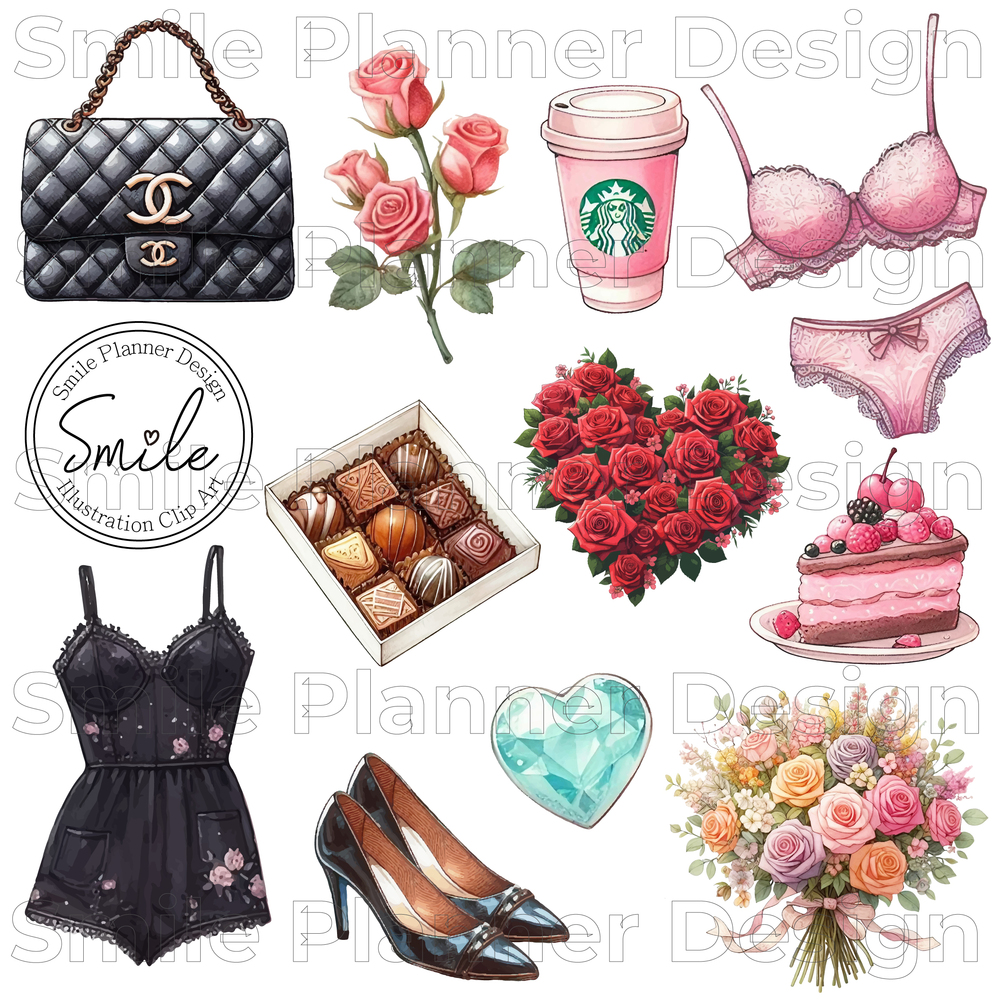 Fashion Girl Valentine's Day Clip Art set featuring hand-drawn aesthetic elements: Valentine's Day card, Bouquet of roses, Cake, Sweet chocolates, Candlelight dinner, Heart-shaped balloons, handbags, pajamas, jewelry, handbags, high heels, underwear, pajamas, cocktails and more.